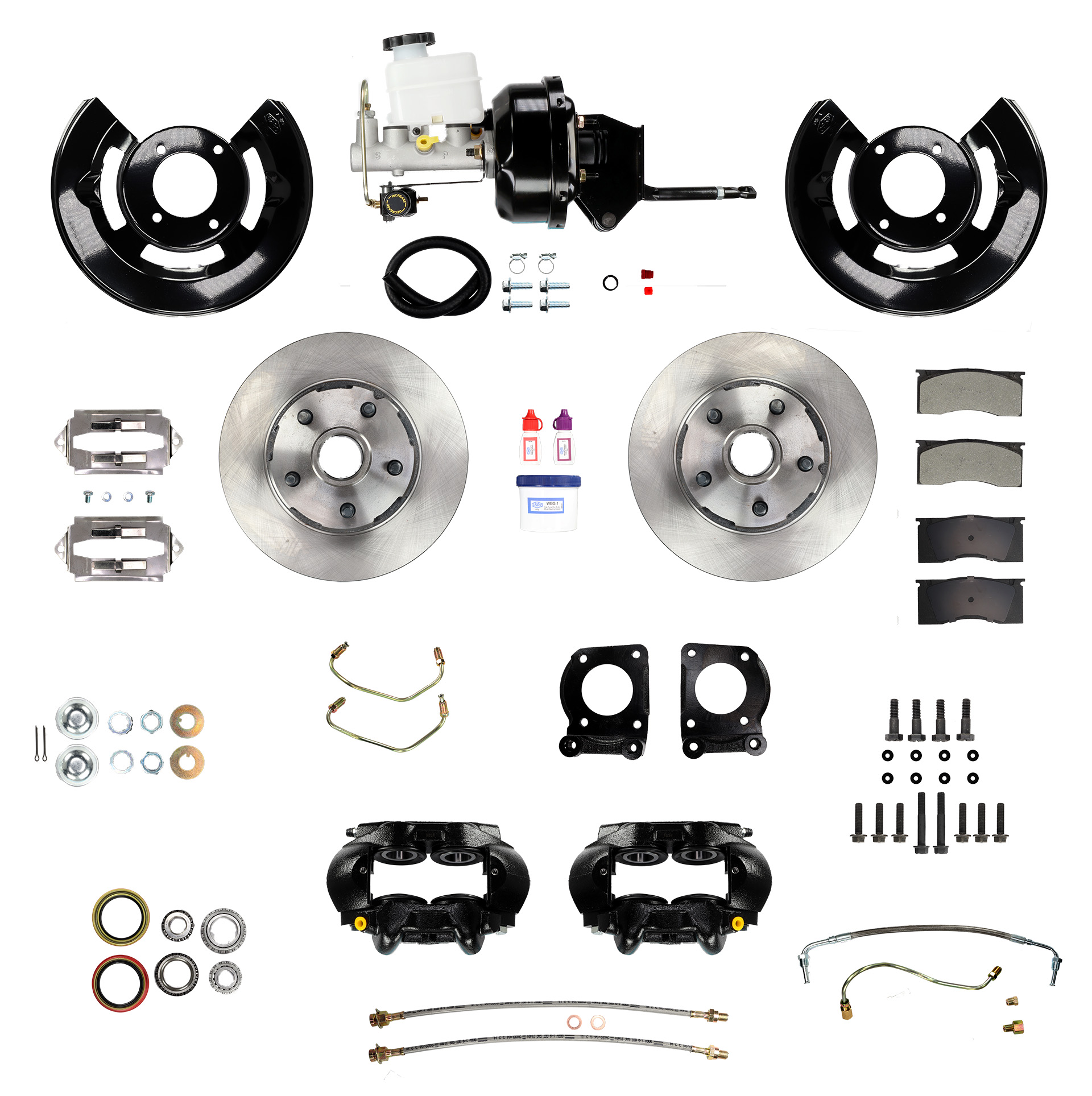 The kit includes everything needed to swap out your front drum brakes for OE Kelsey-Hayes type 4 piston caliper front disc brakes originally found on 1965-1967 V8 Mustang and other 60’s Ford cars. All new easy to install parts including dust shields, caliper brackets, corrosion protected calipers, brake pads, braided stainless steel brake hoses, hose brackets and attachment hardware, adjustable proportioning valve with convenient mounting bracket, a master cylinder with an integral residual pressure valve, master cylinder outlet adapter(s), an all metal master cylinder bleeding kit, an adjustable pushrod, wheel bearings, wheel seals, caliper attachment hardware, wheel attachment hardware, dust caps, performance slotted rotors with bearing races pre-installed, correct grade 8 attachment bolts, medium and high strength thread lockers, and high temperature wheel bearing grease. Note that you will need to adapt or re-fab your hard brake lines to accommodate the proportioning valve and the master cylinder.